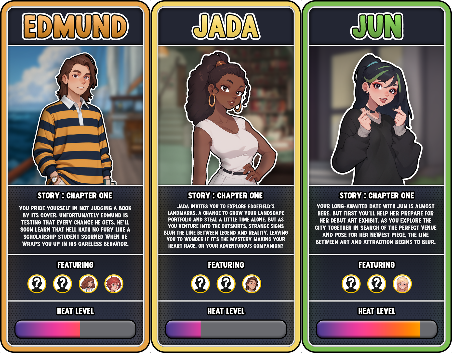 - A brief description of Chapter One of each character's storyline